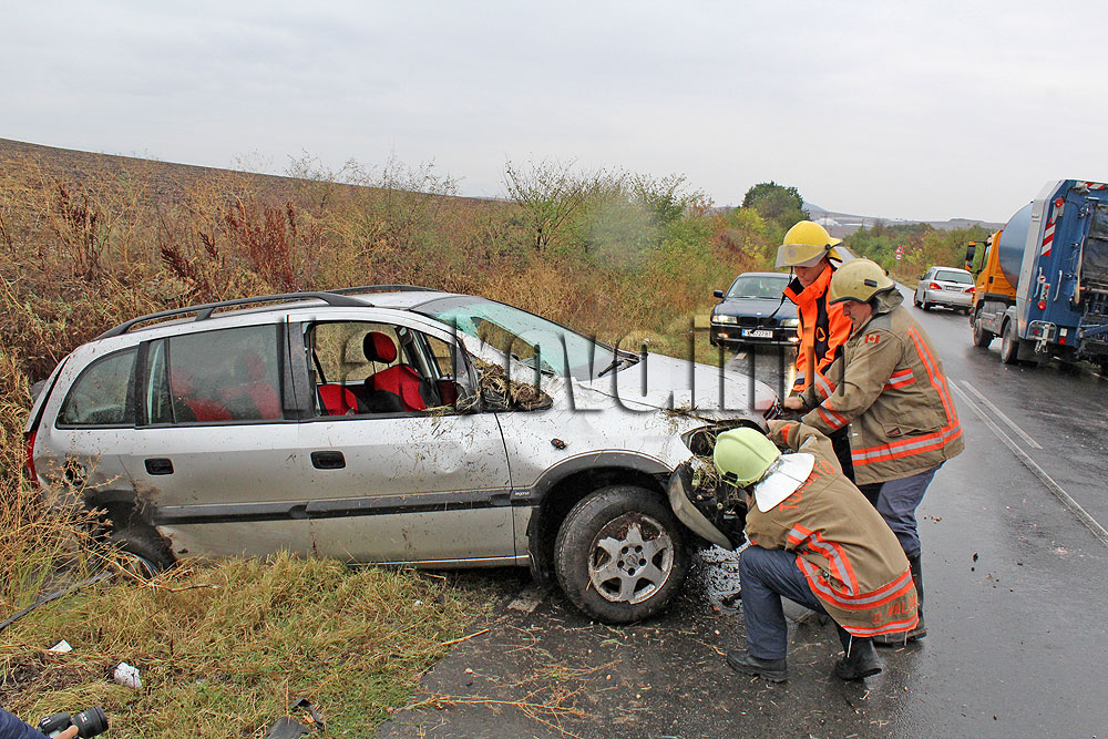 Колата е поднесла на мокрия асфалт и се е забила в канавката. Преди да бъде качен в линейката шофьорът е споделил, че друга кола му е препречила пътя.