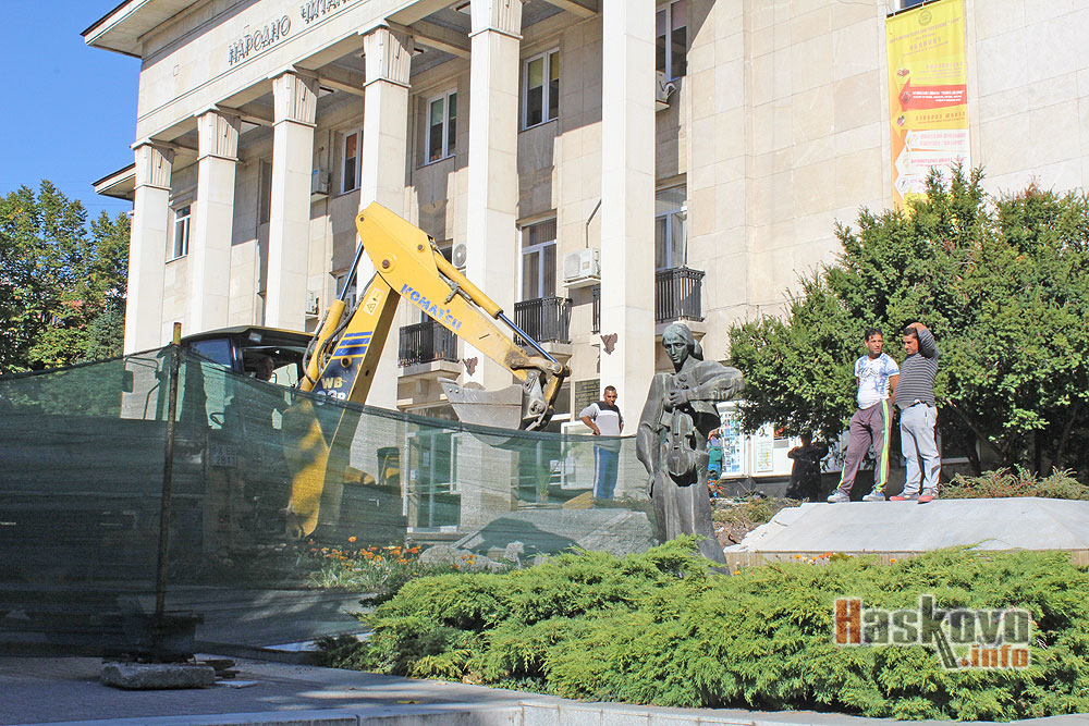 Багер разкопава пред хасковското читалище "Заря" за изграждането на рампа за хора с увреждания.