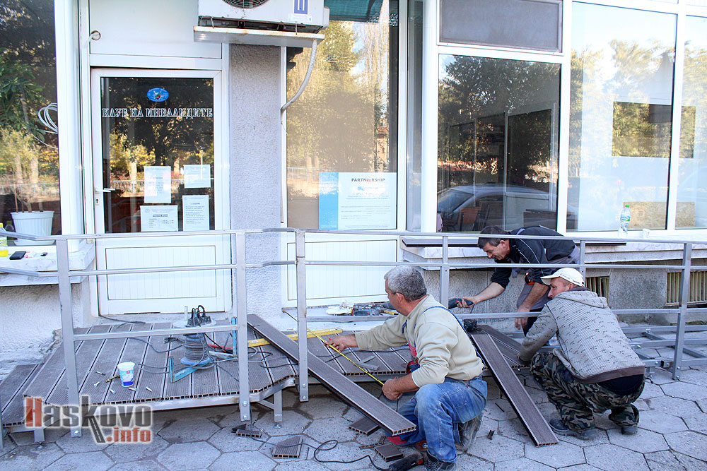 Рампа се монтира пред входа на Клуба на инвалидите на хасковския булевард „България“ в рамките на ремонта, който се извършва там.