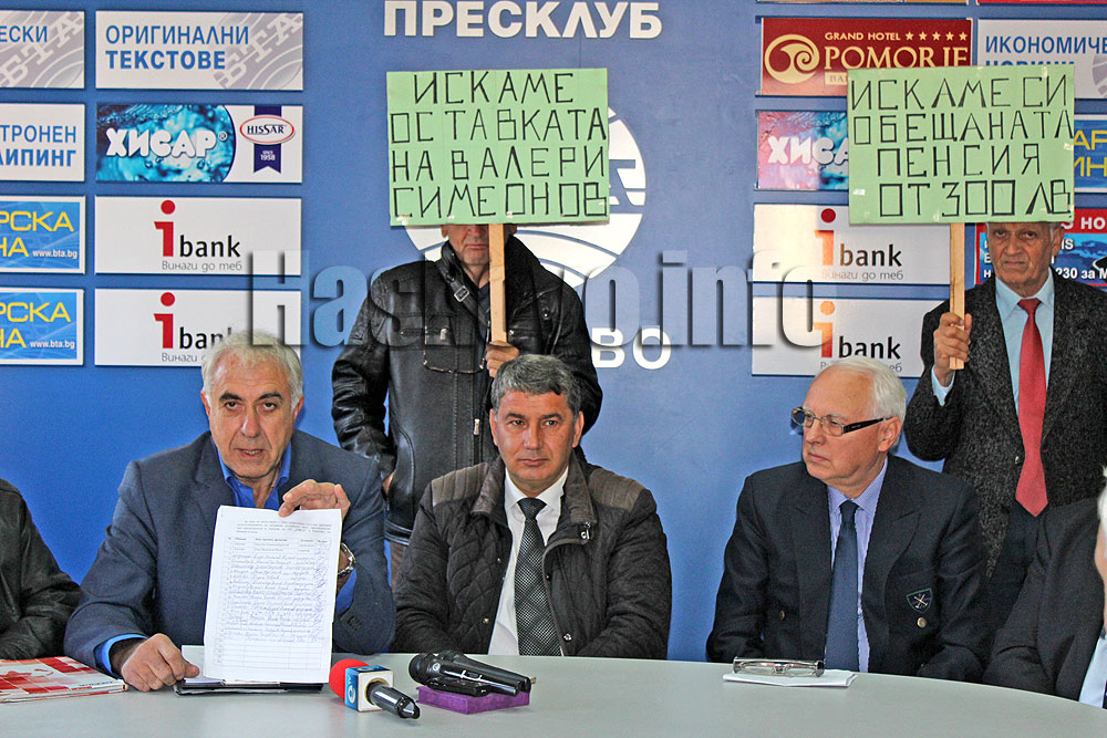 Това стана на пресконференция, на която бяха вдигнати плакати с надписи Искаме оставката на Валери Симеонов, Искаме си обещаната пенсия от 300 лв.