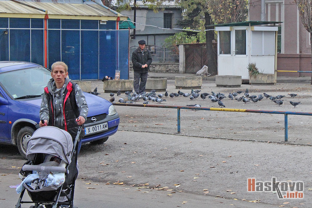 Хасковлия храни с хляб ято гълъби край пазара до църквата "Св. Архангел Михаил" в областния град.
