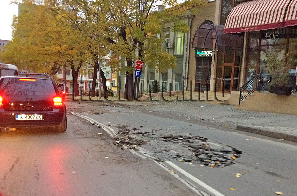 Асфалтът е пропаднал на голяма площ срещу хотела на булеварда. Заради проблема по Кърджалийска се образуваха големи задръствания.