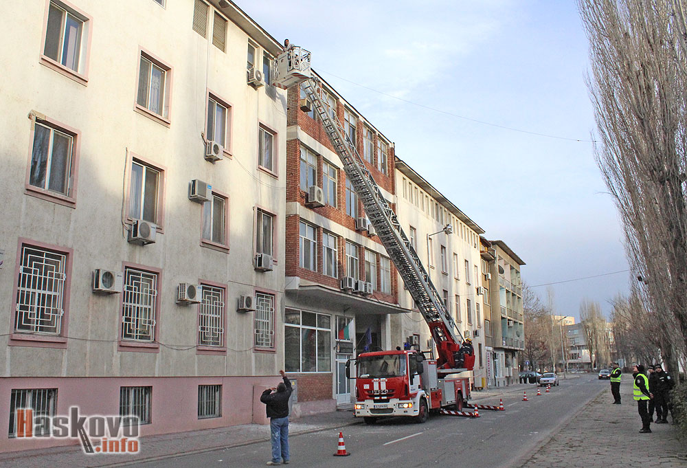 Работници обрушват с помощта на пожарникарската стълба повредената мазилка от фасадата на областната дирекция на полицията в Хасково.
