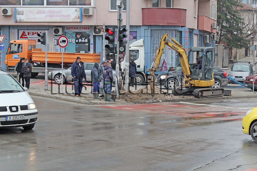 Аварийният екип отстранява аварията в кръстовището на булевардите „България“ и „Съединение“ до зеленчуковия пазар.