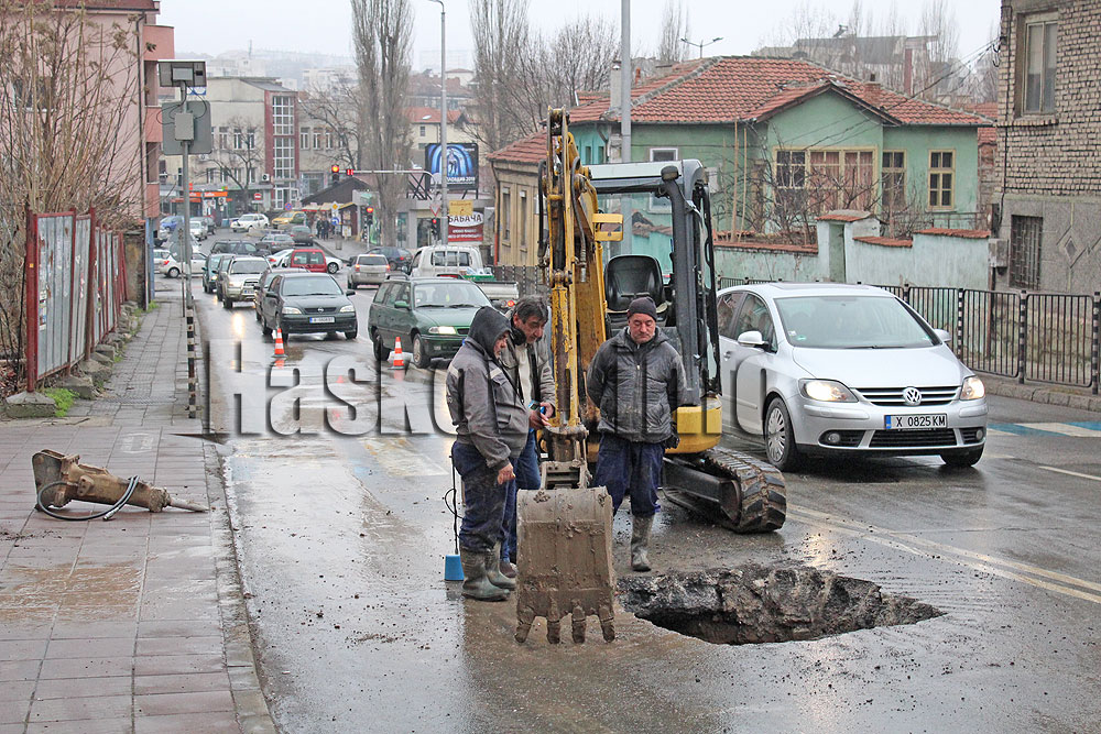 Аварийният екип е на място, но има проблем с точното локализиране на спуканата тръба. От общинска полиция също са там, за да не стане инцидент със засиления трафик.
