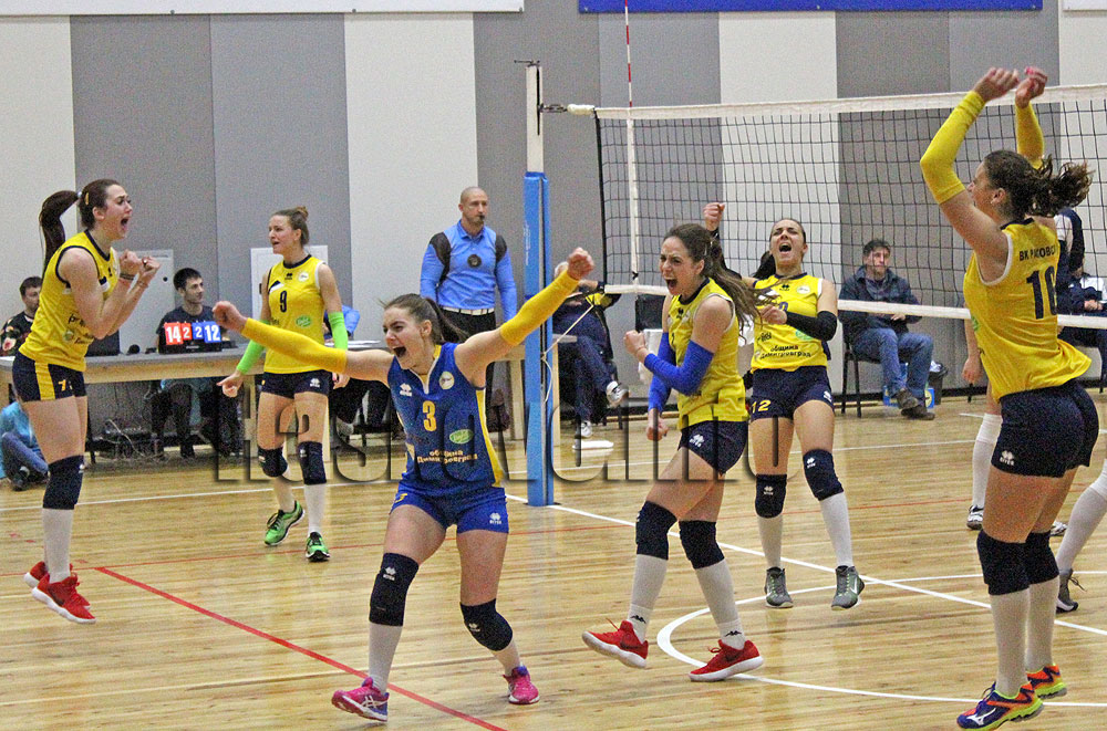 Момичетата на треньора Габриела Айшинова показаха характер и победиха „сините“ с 3:2 гейма (25:19, 21:25, 12:25, 25:13, 15:12) в среща продължила малко над 2 часа. Въпреки че допуснаха обрат до 1:2, нашите не се отказаха и с мощна игра, подкрепяни от публиката успяха да стигнат до тайбрек, който уверено спечелиха и затвориха мача.