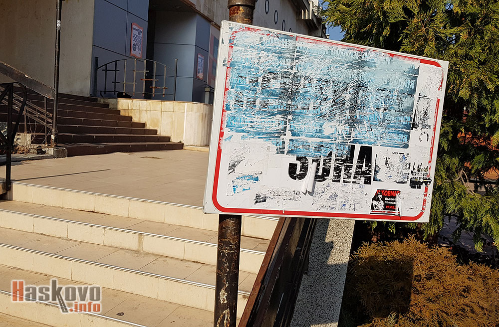Множество лепенки скриват и вече са повредили табелата за Пешеходна зона срещу кметството в Хасково.
