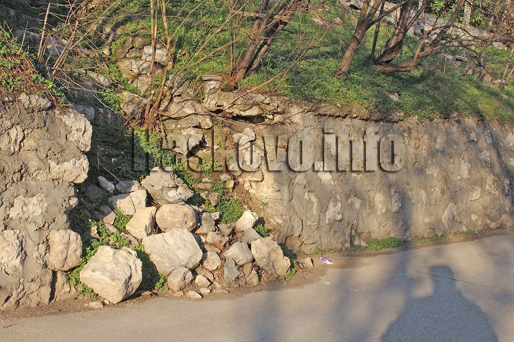 Каменната стена поддава в участъка, където улицата е еднопосочна. Хората се притесняват, че камъните ще се свлекат на уличното платно.