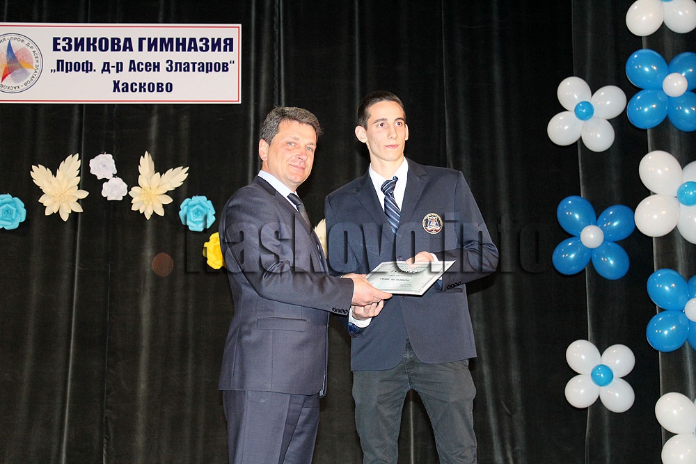 Единадесетокласникът в хасковската Езикова гимназия „Асен Златаров“ Георги Васев получи наградата „Ученик на годината“ на днешния патронен празник на гимназията.
