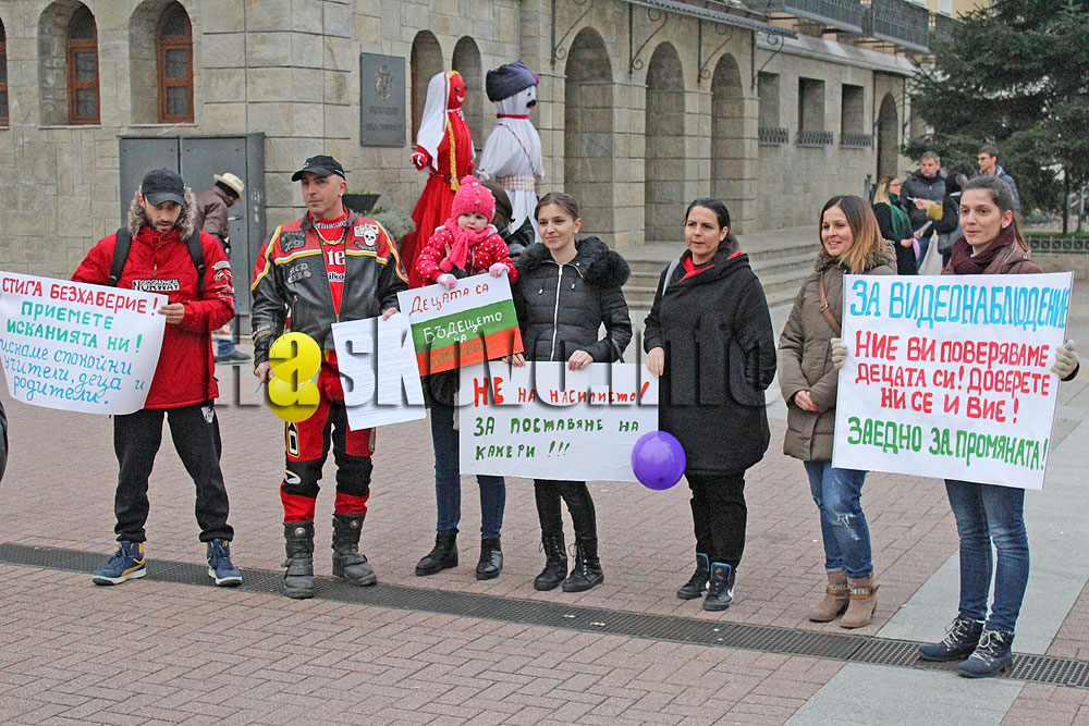 Родителите носеха плакати с надписи: „За видеонаблюдение. Ние ви поверяваме децата си! Доверете ни се и вие! Заедно за промяната!“, „Децата са бъдещето на България“, „Не на насилието! За поставяне на камери!!!“, „Стига безхаберие! Приемете исканията ни! Искаме спокойни учители, деца и родители“.