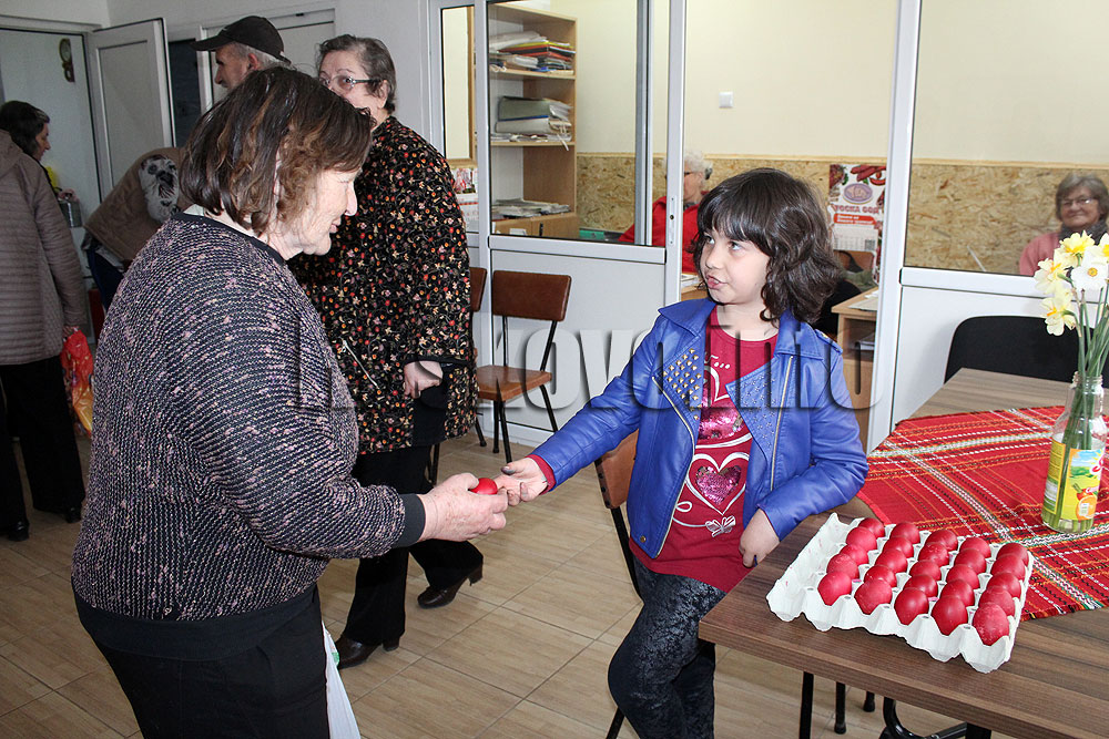 На обяд, когато хората пристигаха за да вземат храната си, която се приготвя в клуба, те бяха посрещани от председателката Милка Костова и първокласничката Малена Москова. 7-годишното момиче само е изявило желание да помага и да раздава яйцата. По традиция от клуба всяка година правят този жест по Великден.