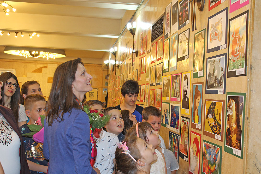 Еврокомисарят беше посрещната от кмета Добри Беливанов пред читалище „Заря“, където бе подредена изложба на изпратените за конкурса рисунки.