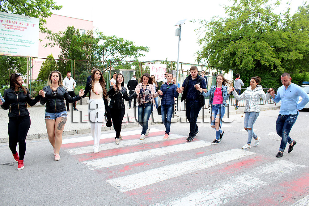 На място пристигнаха две патрулки, но не се стигна до намесата на органите на реда. Шофьори надуваха клаксони, за да поздравят празнуващите абитуриенти, които пуснаха и димки.