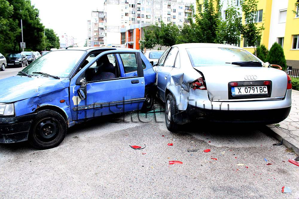 На завоя, малко преди кръстовището с булевард „Васил Левски“, Реното е поднесло на мокрия от дъжда асфалт. Шофьорът е загубил управлението и се е ударил в първия от паркираните автомобили по платното пред блоковете – Ауди.