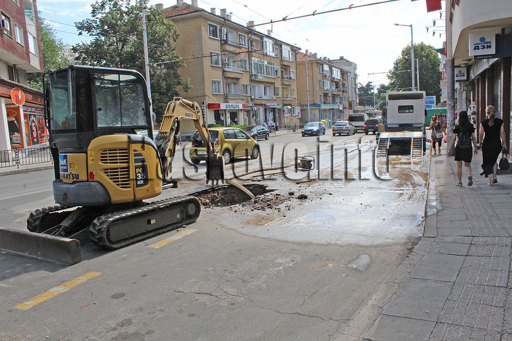 Проблемът е до автобусната спирка зад читалище „Заря“. Аварийният екип разкопа асфалта. Водата от кръстовището край автогарата до читалището е спряна.