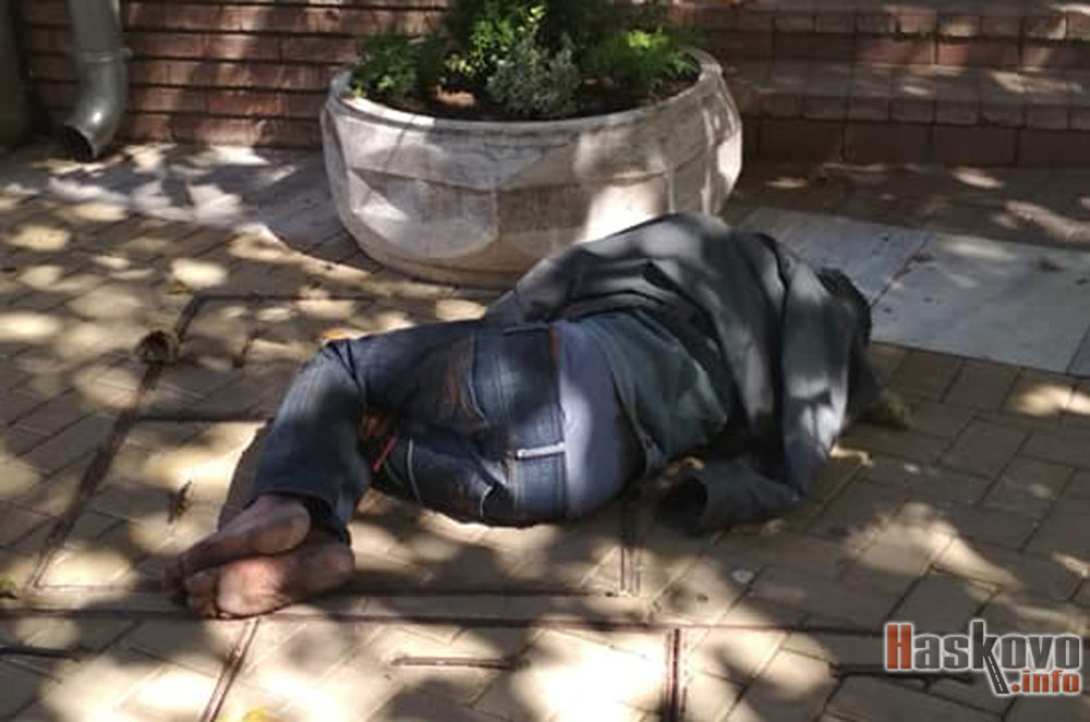 Мъж е легнал на сянка на пешеходната алея в центъра Хасково. Преди няколко дни той беше вдигнат от там с полиция.