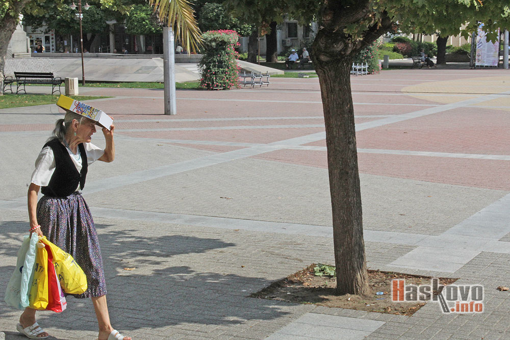 Хасковлийка се пази с картон от силното следобедно слънце.
