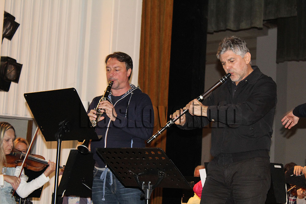 Кавалджията Теодосий Спасов, кларинетистът Илиян Илиев и трите хасковски оркестъра направиха днес репетицията на сцената на читалище „Заря“.
