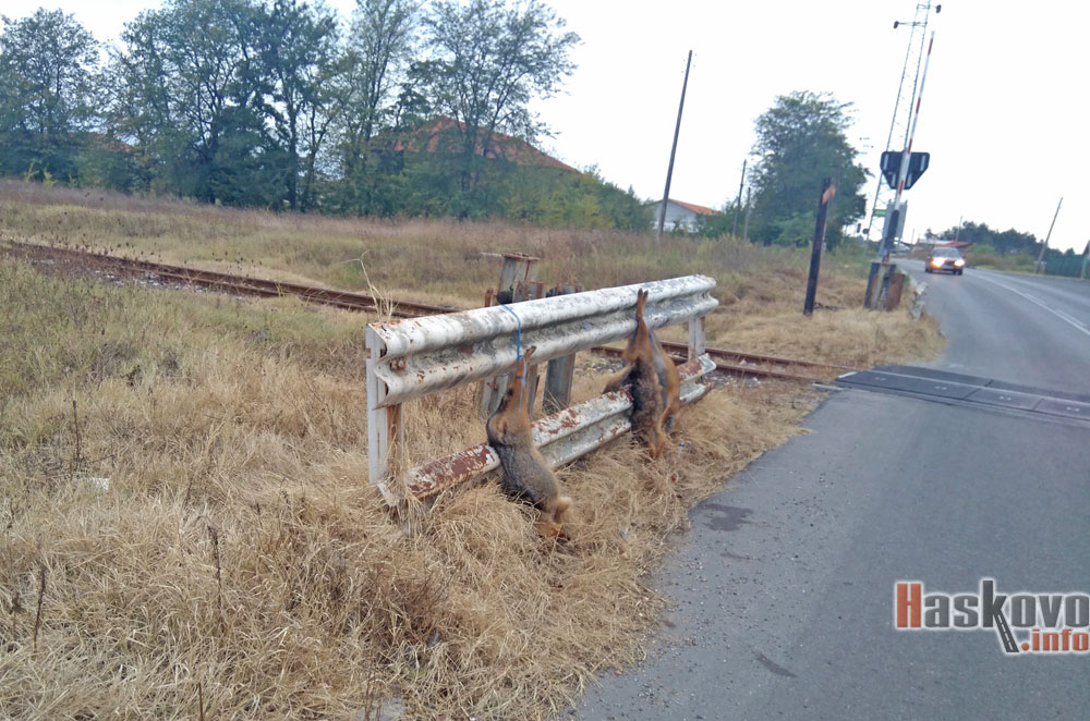 Снимки на убити лисици, закачени на мантинела до железопътните линии в село Книжовник изпратиха читатели на Haskovo.info.