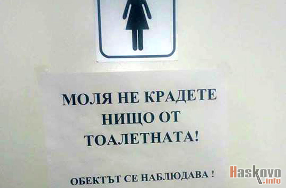„Биг Брадър“ влезе и в тоалетните. В харманлийския културен център са залепили предупреждение към евентуалните крадци, че тоалетните са под наблюдение, сигнализираха със снимка читатели на Haskovo.info