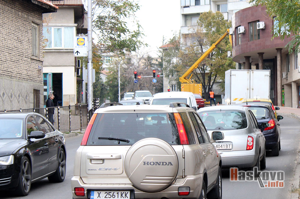 За големи задръствания, причинени от вишка, почистваща фасада на хасковския булевард „Съединение“, сигнализираха читатели на Haskovo.info.