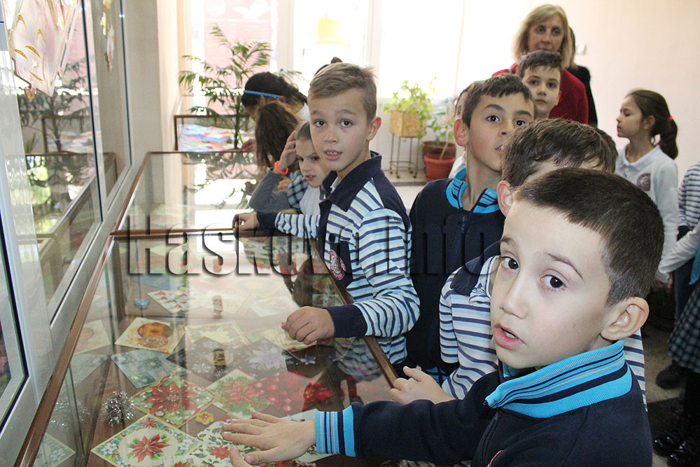 Експозицията е под мотото „Коледна приказка“ и първи й се насладиха второкласници от ОУ „Христо Смирненски“ с класен ръководител Богдана Бойчева. Децата бяха зарадвани от библиотекарката Каварджиева с по една салфетка. Тя сподели, че голямата й колекция от салфетки е около 4000.