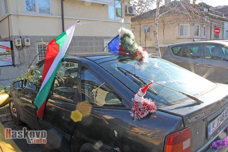 Лек автомобил Опел, паркиран до комплекс „Спартак“ в Хасково, е целият в коледно-новогодишна украса и знамена.