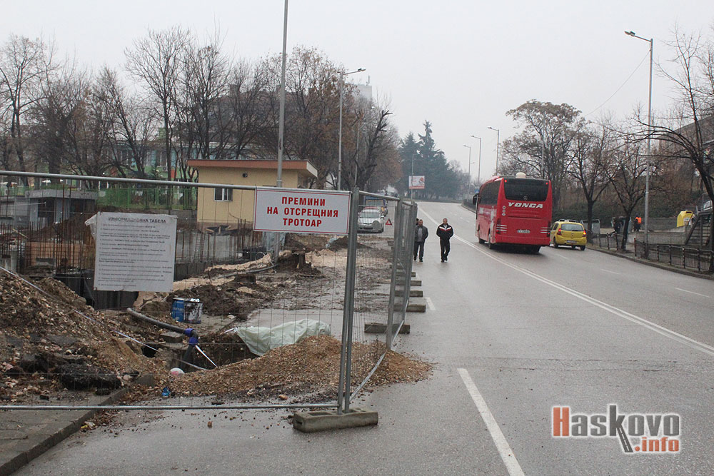 Пешеходци се движат по платното на хасковския булевард „Стефан Стамболов“ в района на ПМГ „Боян Петканчин“ заради строеж, който е заел тротоара. Шофьорите трябва да карат внимателно.