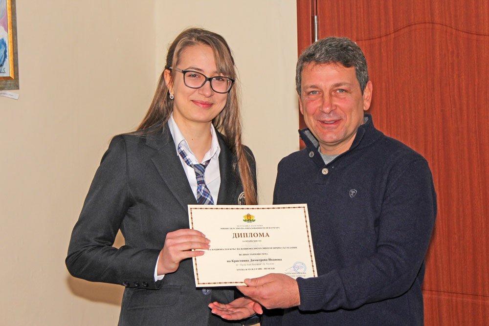 Класирането на учениците е според резултата от показаните умения на втория чужд език, без значение от изучавания първи чужд език. Форматът на състезанието е еднакъв и за двата кръга – регионалният и националният. Времетраенето е 180 минути, а писмeните работи са анонимни. Директорът на гимназията Деян Янев връчи наградата на гимназистката.