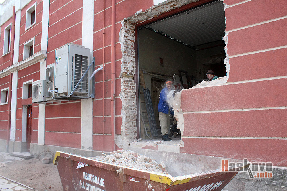 Работници избиха дупка в северната стена на хасковския театър „Иван Димов“. Там ще има вход за внасяне на декорите, които досега се вкарваха откъм платното на булевард „България“ и така се създаваха задръствания.