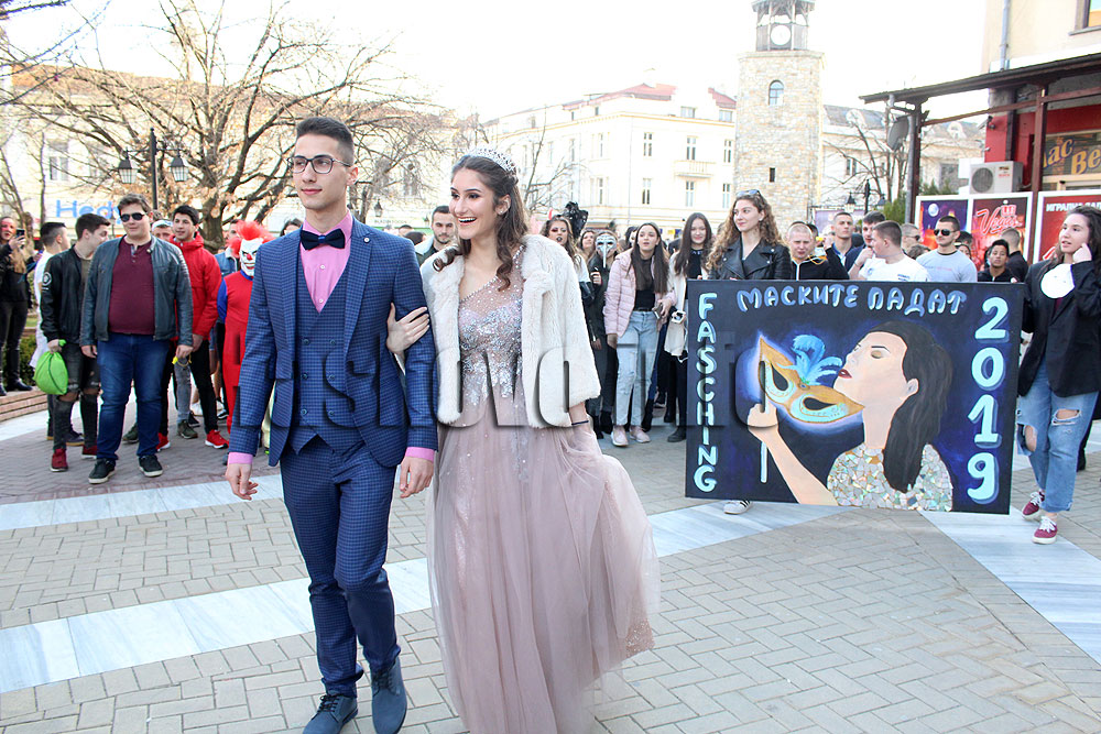 Учениците се събраха пред театър „Иван Димов“. Мотото на пролетния карнавал е „Маските падат“. Част от младежите бяха маскирани, като имаше красиви принцеси и клоун.